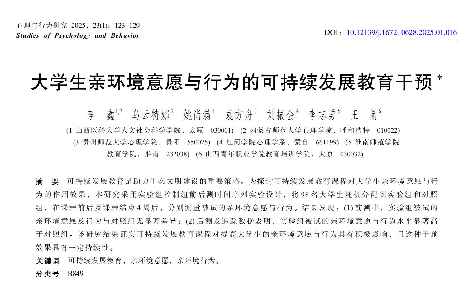 近日,我院李鑫老師撰寫的學術論文《大學生親環(huán)境意愿與行為的可持續(xù)發(fā)展教育干預》被《心理與行為研究》(CSSCI)錄用并發(fā)表。