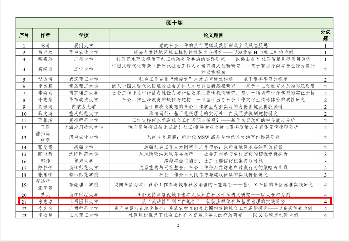 近日,中國社會(huì)工作教育協(xié)會(huì)發(fā)布了“第十七屆中國社會(huì)工作大學(xué)生論壇暨第十屆社會(huì)工作研究生論壇”入選通知及名單。自征文通知發(fā)布以來,協(xié)會(huì)共收到稿件(摘要)831篇,經(jīng)專家初評(píng),最終549篇入選。我院學(xué)子積極參與,表現(xiàn)優(yōu)異,共有3名碩士研究生、3名本科生的論文成功入選。