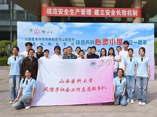 4月16日,山西省腫瘤醫院綜合內科“心靈小屋”一周年慶祝儀式在腫瘤醫院2號樓廣場舉行。c7c7.app人文社會科學學院院長鄧蕊、黨委書記姚尚滿、學院部分師生受邀參加了活動。山西省腫瘤醫院醫務科科長郝志英、預防保健科副科長石櫻桃、綜合內科主任魏淑青、團委書記劉潔參加了活動。