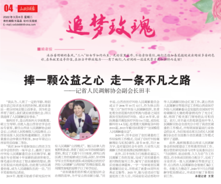 2022年3月8日山西法治報“三·八”專版頭條報道了我院田豐副教授。山西法治報是山西省唯一的省級法治類報紙,是宣傳及普及法律知識,實施依法治國戰略、推進依法治省進程和加強社會治安綜合治理的重要輿論工具,是我省政法戰線指導工作,交流經驗、宣傳典型最具權威性的主陣地,已成為20萬讀者不可或缺的良師益友和法律顧問。