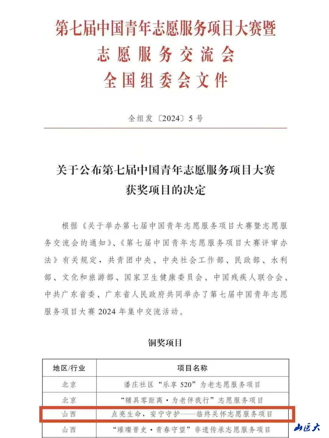 第七屆中國青年志愿服務項目大賽由共青團中央、中央社會工作部、民政部等聯(lián)合主辦。中國青年志愿服務項目大賽是目前國內(nèi)志愿服務領域最權威、規(guī)格最高的賽事活動,每兩年舉辦一次。本屆大賽自啟動以來,吸引了全國14000余個志愿服務項目參與,競爭異常激烈。我院寧養(yǎng)志愿服務隊自2013年成立以來,始終堅守使命,專注于為貧困晚期癌癥患者提供全方位照護,涵蓋鎮(zhèn)痛治療、心理輔導、生命倫理及寧養(yǎng)善終關懷等多個層面,致力于實現(xiàn)“逝者善終 留者善別”的人道目標。11年來我校寧養(yǎng)服務總?cè)藬?shù)達13500余人,服務總時長達18000余小時,直接受益1100余個家庭,用實際行動詮釋著對生命的尊重與關愛。