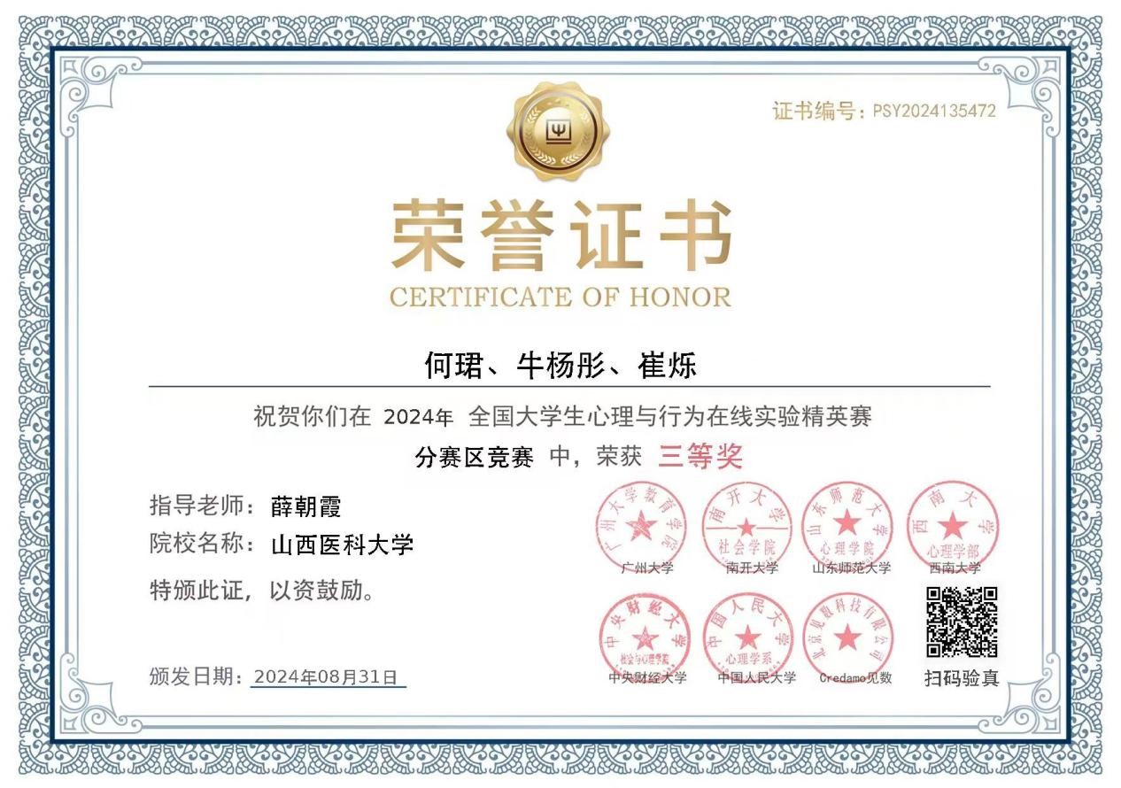 2024 年全國大學生心理與行為在線實驗精英賽分賽區競賽結果公布,c7c7.app何珺、牛楊彤、崔爍同學在比賽中斬獲三等獎,指導老師為薛朝霞。
