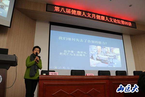 講座主題是“三塊告別牌――給至暗之路點亮一盞明燈”。安老師以一系列問題開始了今天的講座:你是否曾與人談?wù)撨^“告別”?什么情況下討論的?為什么沒有談,不想、不敢還是不會?引發(fā)同學(xué)們思考。接著,安老師分別從三個方面講述了人生最后的告別:第一塊告別牌是“給至暗之路一盞燈”,死亡是一種本能,我們要拆掉死亡禁忌的墻,好好告別,使逝者安靈,生者安心;第二塊告別牌是“我的生命,誰做主”,安老師講了醫(yī)學(xué)倫理的基本原則,找回生命自主權(quán);第三塊告別牌是“陪伴是最長情的告別”,教會我們?nèi)绾闻惆椋绾蝺A聽。最后安老師給予同學(xué)們?nèi)齻貼士,指導(dǎo)同學(xué)們勇敢、正確的面對死亡。