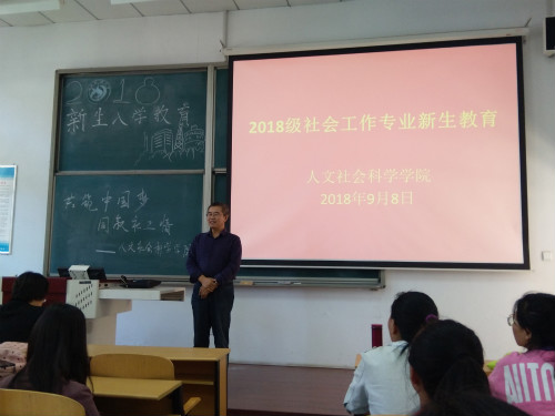 秋風送爽,丹桂飄香。2018年9月8日,我院2018級社會工作專業新生入學教育在專教慎思B103舉行。人文社會科學學院院長王志中教授,人文社會科學學院黨總支劉曉麗副書記,社會工作學系優秀教師代表席婷婷老師,2018級社會工作專業輔導員張猛老師及2018級社會工作專業全體115名新生參加了新生入學教育。