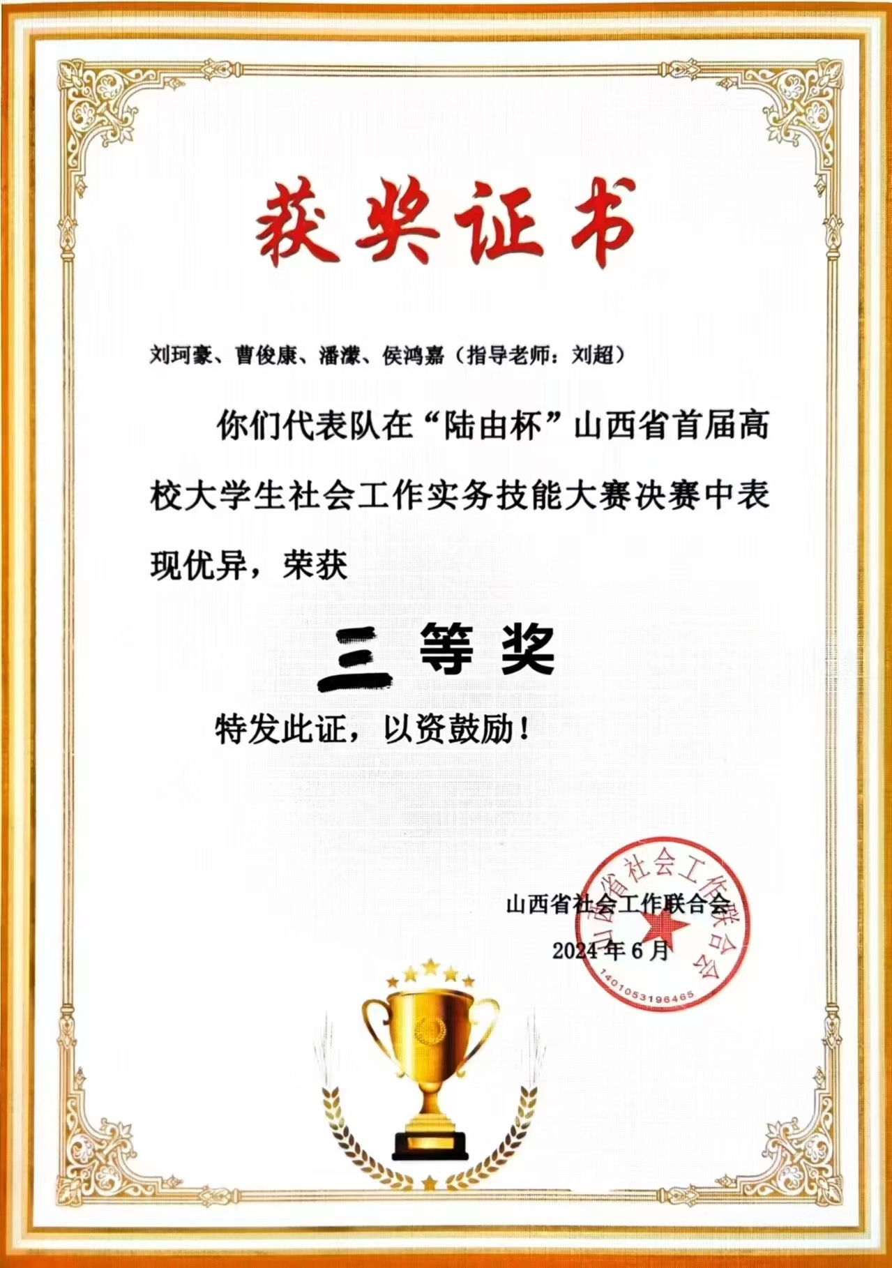 2024年 劉珂豪、曹俊康、潘濛、侯鴻嘉(指導老師劉超 ),在“陸由杯”山西省首屆高校大學生社會工作實務技能大賽決賽獲三等獎,山西省社會工作聯(lián)合會頒獎。
