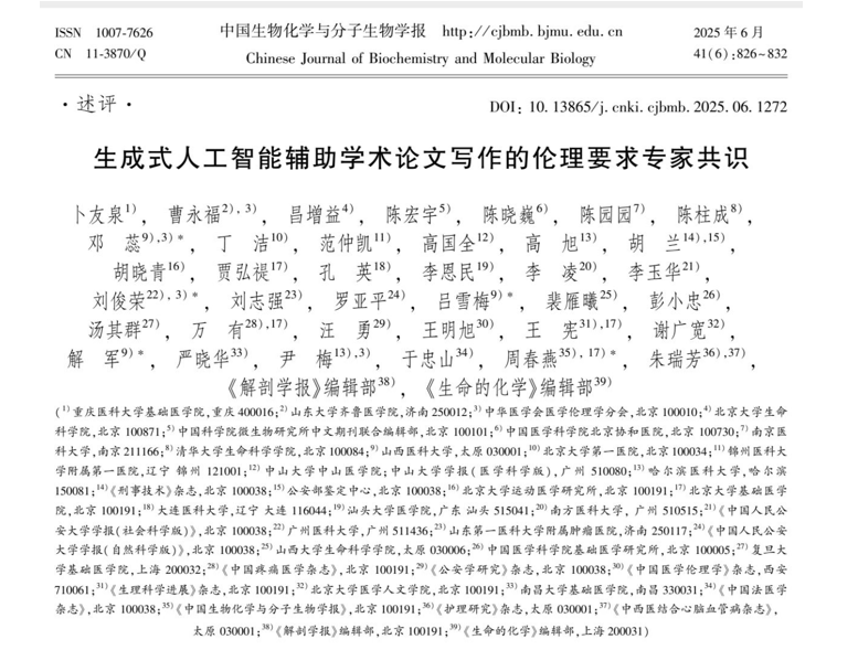 為充分應對生成式人工智能在學術論文寫作中帶來的倫理挑戰,由中華醫學會醫學倫理學分會、《中國生物化學與分子生物學報》等學術期刊、中國醫學科學院北京協和醫院等醫療機構、北京大學、清華大學、復旦大學、中山大學及c7c7.app等高校共同牽頭,來自全國共39 家學術團體、學術期刊、醫療機構、高等院校的多學科專家共同編撰的《生成式人工智能輔助學術論文寫作的倫理要求專家共識》已于 2025 年 6 月在《中華生物化學與分子生物學報》(第 41 卷第 6 期)正式發布。標志著我校在人工智能與學術倫理交叉領域邁出了關鍵一步。