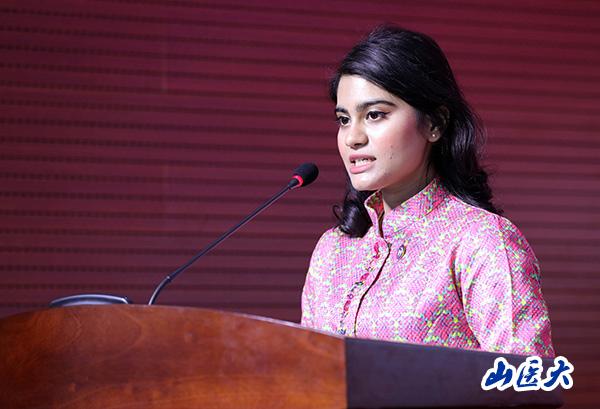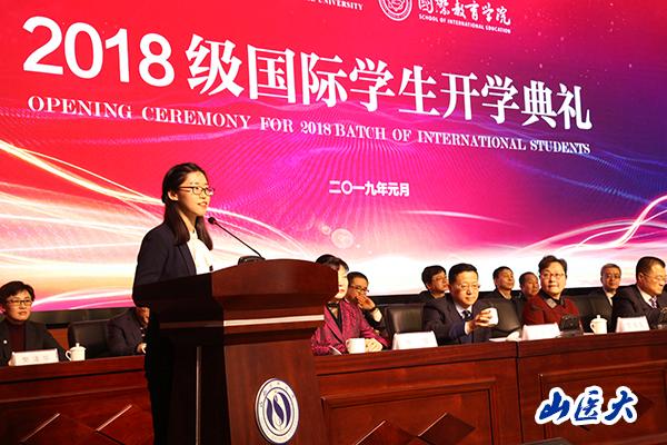 Shi Yun, a student from Pakistan, spoke as the student representative in Grade 2018. She introduced her elder sister and twin younger sister who were also freshmen, and presented that it was the historical accumulation and rigorous teaching style of Shanxi Medical University that attracted them to come here. The three sisters will work together with all the new students to cherish the six years and study hard.