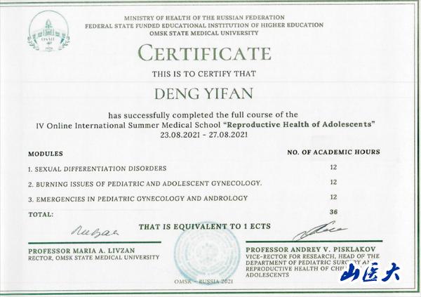 (俄羅斯鄂木斯克國立醫科大學頒發的項目證書)