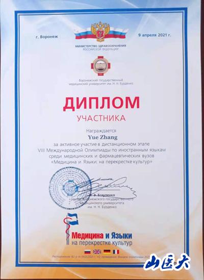 4月8日,第八屆俄羅斯沃羅涅日國(guó)立醫(yī)科大學(xué)國(guó)際語言大賽以線上研討會(huì)形式舉辦。我校第二臨床醫(yī)學(xué)院2018級(jí)研究生張玥,以及來自四川大學(xué)、哈爾濱醫(yī)科大學(xué)、南京醫(yī)科大學(xué)和大連醫(yī)科大學(xué)的6位同學(xué)作為中國(guó)學(xué)生代表,與俄羅斯等國(guó)學(xué)生共同參會(huì)。