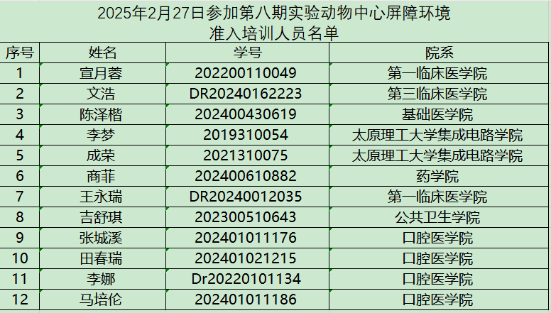 2025年2月27日參加第八期屏障環境準入培訓人員名單