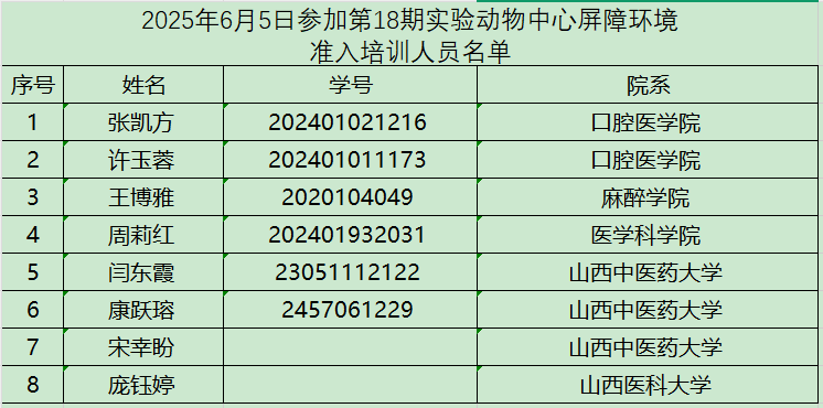 2025年6月5日參加第18期實(shí)驗(yàn)動(dòng)物中心屏障環(huán)境準(zhǔn)入培訓(xùn)人員名單