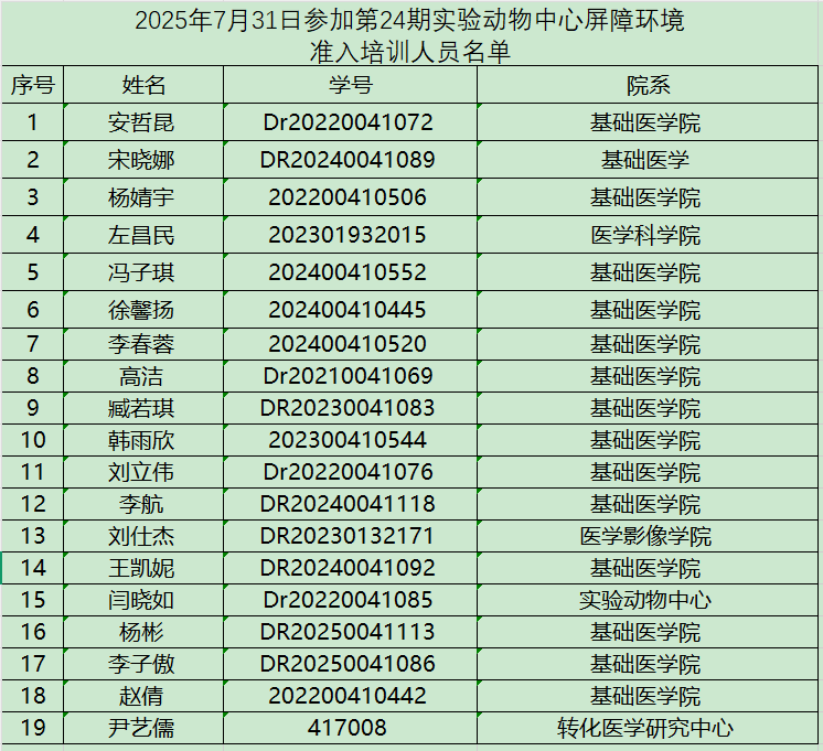 請以下參培人員于2025年7月31日下午14:30到實驗動物中心三層多功能會議室參加培訓和考試!
