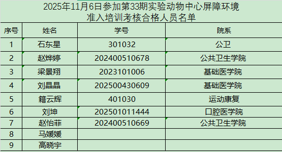 以下培訓(xùn)考核合格人員需在一個月內(nèi)進入屏障開展動物實驗,逾期須重新接受培訓(xùn)和考核!