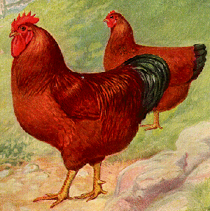 4. 洛島紅雞(Rhode Island Red):育成于美國洛德島州,屬兼用型。體羽深紅色,尾羽黑色,喙褐黃色,脛、皮膚黃色。性成熟期約180天,年產蛋量約180枚,成年體重:公雞3.7kg,母雞2.75kg。