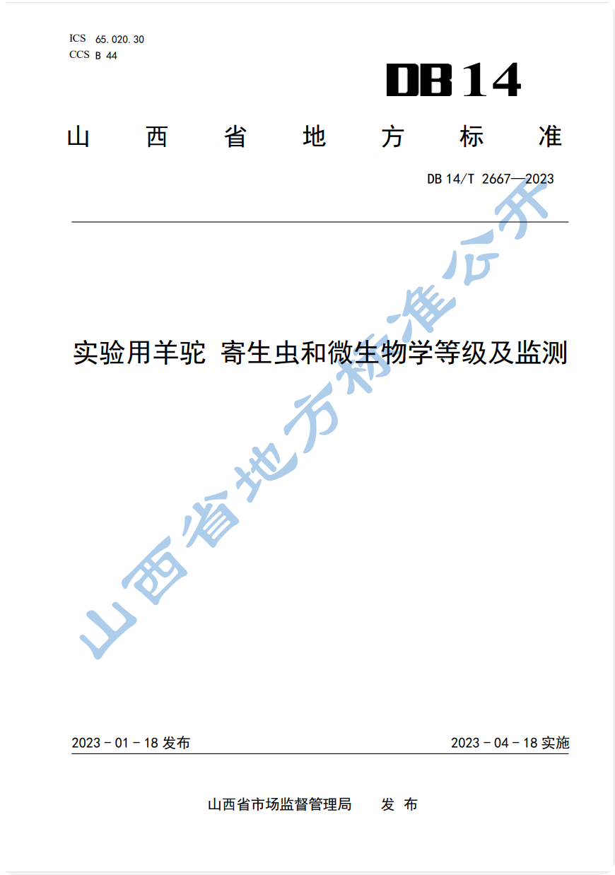 DB 14/T 2667-2023 實驗用羊駝 寄生蟲和微生物學等級及監測