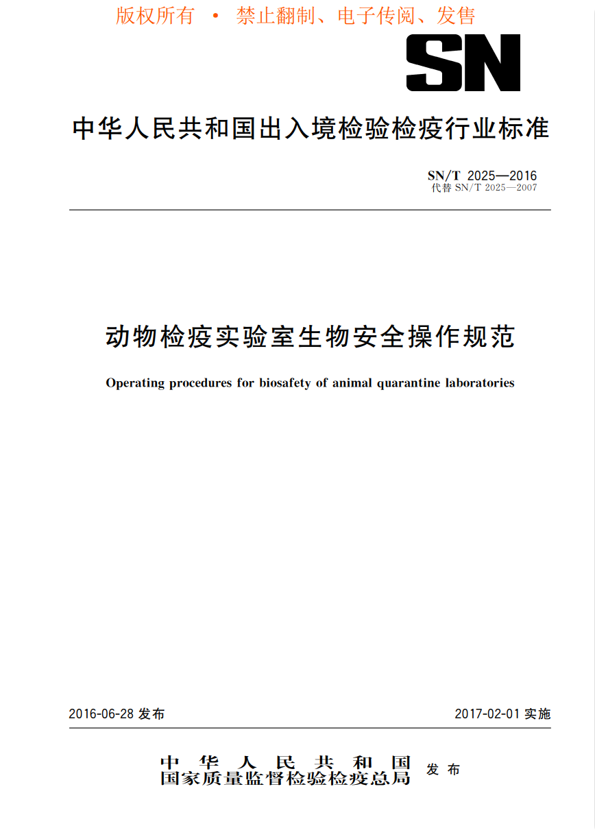 SN-T 2025-2016 動物檢疫實驗室生物安全操作規范