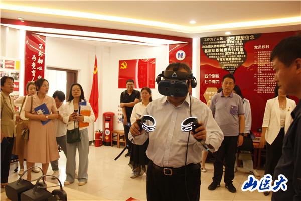 在管理科學與工程學院,學院黨委副書記陳霞重點介紹了“標桿院系”建設工作經驗,并圍繞開展基層黨建工作思路、創新黨建活動方式、加強品牌建設、創建特色亮點及黨務資料規范管理等對山西財經大學管理科學與工程學院的黨建工作進行了全面而又系統的介紹。她帶領基礎醫學院調研人員參觀了黨建活動陣地智慧黨建體驗中心,老師們通過文字、圖片、影像、數據等內容,感受“情景模擬+互動體驗”功能。王卓書記 “沉浸式”體驗了紅軍爬雪山過草地的艱辛,了解了黨建“雙創”培育創建中“VR”技術的使用。