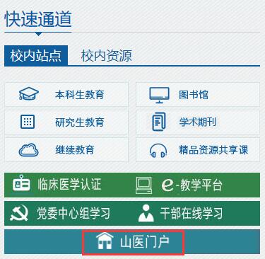 (1)山醫(yī)門戶在學校官方網站左下角“快速通道—校內站點”設置了圖片鏈接,單擊進入山醫(yī)門戶登錄頁。