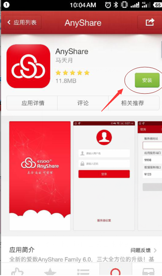山醫(yī)云盤支持Android系統(tǒng)的智能手機(jī),通過安裝Android APP客戶端,訪問AnyShare中的文檔資料。訪問“安卓市場”、“百度應(yīng)用”、“小米應(yīng)用”等,搜索“AnyShare”,下載安裝應(yīng)用即可。見圖7。