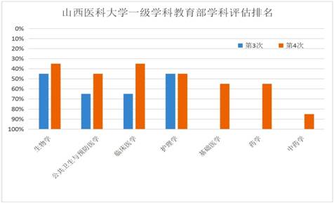12月28日,教育部學位與研究生教育發展中心公布了全國第四輪學科評估結果,我校在此次學科評估中取得較好成績。本次評估我校共有7個一級學科參評,我校臨床醫學、生物學位于前40%,為B-等級;公共衛生與預防醫學、護理學位于前50%,為C+等級;基礎醫學和藥學位于前60%,為C等級;除中藥學外,其他六個一級學科全部進入全國前70%。相比較2012年第三輪學科評估結果,我校臨床醫學前進約30個百分點,公共衛生與預防醫學前進約20個百分點,生物學科前進約10個百分點,這三個一級學科有較大幅度提升,護理學百分位次排名基本不變。如圖所示。