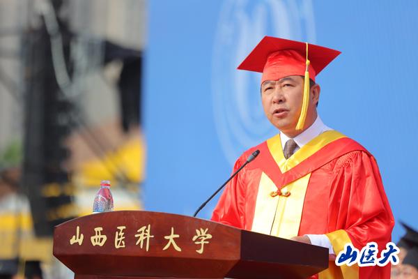 在熱烈的掌聲中,校長、校學位委員會主席李思進向畢業生致辭。他指出,生命本身是一種崇高的智慧。人類迄今為止,還沒完全弄清其中的奧妙。以研究生命為對象的醫學,同樣是一門需要極高智慧、終身學習的學問,是一門具有極強實踐性、人文性的學問。作為一名醫者,既要有仁心仁術,更要有大智慧。他以《不負時代,做有“智”山醫青年》為題,為畢業生提出了三點要求。一是要明辨是非,把穩思想之舵。在這百年醫學殿堂,不僅是學會治病救人的基本知識和技能,步入社會后能夠用所學救死扶傷,更重要的是,要學會獨立思考,有自己的思想,真正成為你自己。在面對五彩斑斕紛繁復雜的世界,能夠明辨是非、辨別善惡、認清真偽,不唯上、不盲從、不跟風;在無數的利益誘惑、大是大非面前,能夠把穩思想之舵,能夠堅守初心底線,挺得住、站得直、行得端。在任何時候,都要以國家、人民利益為重,做一名有智慧的山醫人。二是要終身學習,筑牢立身之本。要養成終生學習的習慣,不要稍有所得就沾沾自喜。通過不斷學習、實踐,筑牢立身之本,點亮智慧人生,才能更好地為患者服務,為社會服務,為國家服務。三是要奮力擔當,不愧青春之我。國家的前途,民族的命運,人民的幸福,是當代中國青年必須和必將承擔的重任。要積極投身第二個百年目標的實現,做親歷者和建設者,承擔重任,要將“個人夢”融入偉大的“國家夢”“民族夢”中,不負韶華、奮力擔當,在擔當中歷練,在盡責中成長,肩負起國家和民族的希望,書寫好新時代的青春篇章,實現好自己、家庭和國家的夢想。
