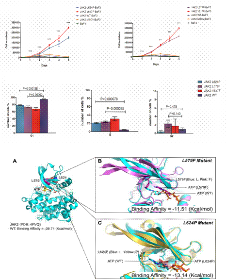 本研究我們通過選取L579F和L624P突變證實JAK2 外顯子13和15區域發生的突變能夠產生同JAK2V617F一樣的細胞增殖效應。晶體結構及蛋白分子動力學模擬顯示,L579F和L624P均可造成JAK2蛋白空間構象的改變,但此兩突變是通過干擾JAK2蛋白與其底物ATP的結合能力導致JH2蛋白結構域失去對JH1結構域的抑制效應;而JAK2V617F則是通過降低JH2結構域αC結構Tm值,改變其穩定性,導致所在JH2區蛋白結構域失去對JH1結構域的抑制效應,進而誘發JAK2自主活化,產生自主促細胞增殖作用。該結果提示盡管JAK2 外顯子13和15區域發生的突變與JAK2V617F突變對JH2結構域產生不穩定的機制略有不同,但最終效果均是引起JH2區蛋白結構域失去對JH1結構域的抑制效應。該研究已發表于International Jounal of Labrratory Hematology雜志。