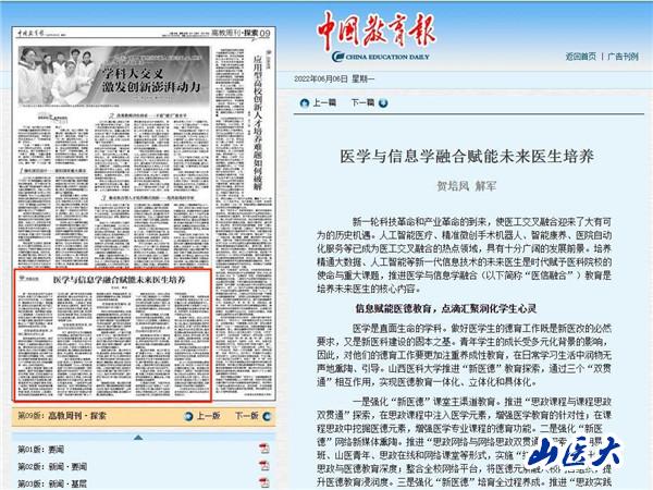 6月6日,《中國教育報》第9版“高教周刊·探索”版刊發我:嘏嚳锝淌、解軍教授的聯合署名文章《醫學與信息學融合賦能未來醫生培養》。