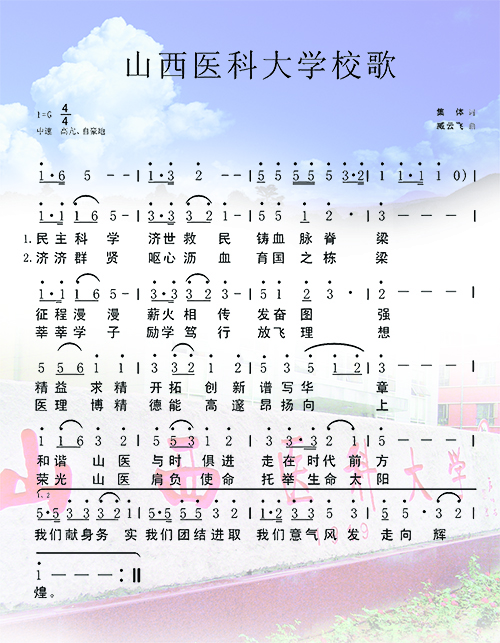 我校原校歌由集體作詞,著名軍旅作曲家臧云飛作曲,是為八十年校慶而作。根據部分教職員工的建議,這次校歌修改保留了原臧云飛所作曲調,對原歌詞進行了修改。修改后的歌詞保留了原句式、原韻。歌詞第一段表現了不斷發展前進的c7c7.app的歷史傳承、深厚底蘊,展現了山醫人薪火相傳的艱辛歷程和自強不息的奮斗精神,展望了學校光輝燦爛的明天。歌曲第二段頌揚了教師潛心教壇、嘔心瀝血、為國育才的紅燭精神,歌頌了白衣天使關愛生命、救死扶傷的人道主義情懷,展示了學子敦品勵志、服務人民、成才報國的遠大理想。歌詞將我校的校訓、校風入詞,進一步弘揚了學校的辦學理念和主體文化精神,具有較強的時代氣息和教育意義。