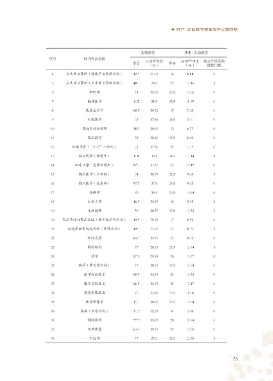 2016-2017 學年,我?榪緯套苊攀749,校內專業平均總學分為221.69,其中法學的實踐教學學分占總學分的比例為24.87%,文學的實踐教學學分占總學分的比例為15.29%,工學的實踐教學學分占總學分的比例為28.57%,醫學的實踐教學學分占總學分的比例為34.40%,管理學的實踐教學學分占總學分的比例為23.56%。醫學選修課學分占總學分的比例為 10.53%,文學選修課學分占總學分的比例為15.53% ,工學選修課學分占總學分的比例為19.39%,管理學選修課學分占總學分的比例為16.62% ,法學選修課學分占總學分的 11.94%