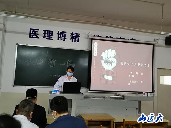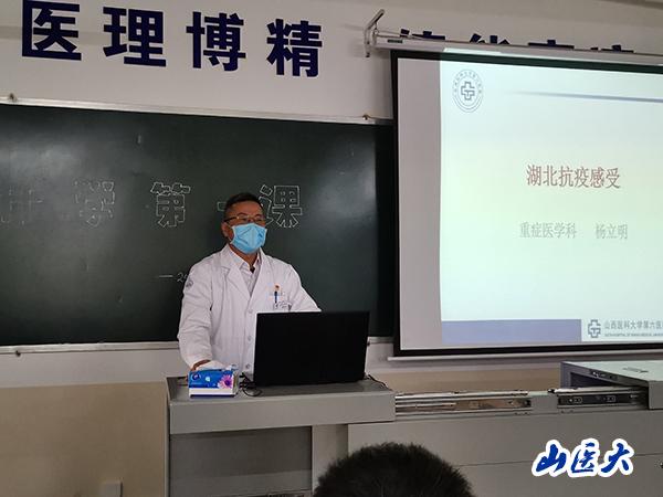 在“返校第一課”上,第六臨床醫(yī)學(xué)院邀請(qǐng)了援顎勇士代表與同學(xué)們進(jìn)行了交流。第六醫(yī)院赴湖北仙桃進(jìn)行抗疫支援的重癥監(jiān)護(hù)室主任楊立明、護(hù)士長(zhǎng)陳靜,為大家講述了整個(gè)赴湖北仙桃抗疫的過程。從匆忙接到命令、趕赴湖北仙桃進(jìn)入重癥監(jiān)護(hù)室工作,從親人的不舍到與仙桃人民相親相愛的共處,從仙桃人民不舍的送別到家鄉(xiāng)親人盼歸的思念,醫(yī)護(hù)人員舍小家顧大家的無畏精神感動(dòng)著在場(chǎng)的每一位同學(xué),每一位教職工。尤其楊立明主任的“三把雨傘”“國(guó)家有難,匹夫有責(zé)”,陳靜護(hù)士長(zhǎng)的“病房里媽媽”“女兒給她講故事”,他們一句句質(zhì)樸的語言,讓在場(chǎng)的師生淚目,此時(shí)的無聲已經(jīng)是最大的有聲。