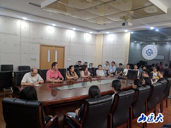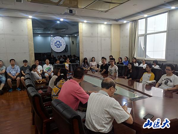 8月19日下午,第六臨床醫學院在迎新院區二樓會議室組織召開學生座談會。副書記蔚鈺瓊出席會議,會議由教學辦主任藺春紅主持。太鋼總醫院醫療公司服務分公司副經理白星華、調度主任岳斌斌、五年級實習學生代表30余人參加座談。