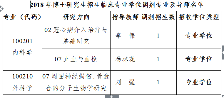 經學校博士研究生招生工作領導組研究決定,現將2018年博士研究生臨床專業學位招生調劑工作有關事宜通知如下: