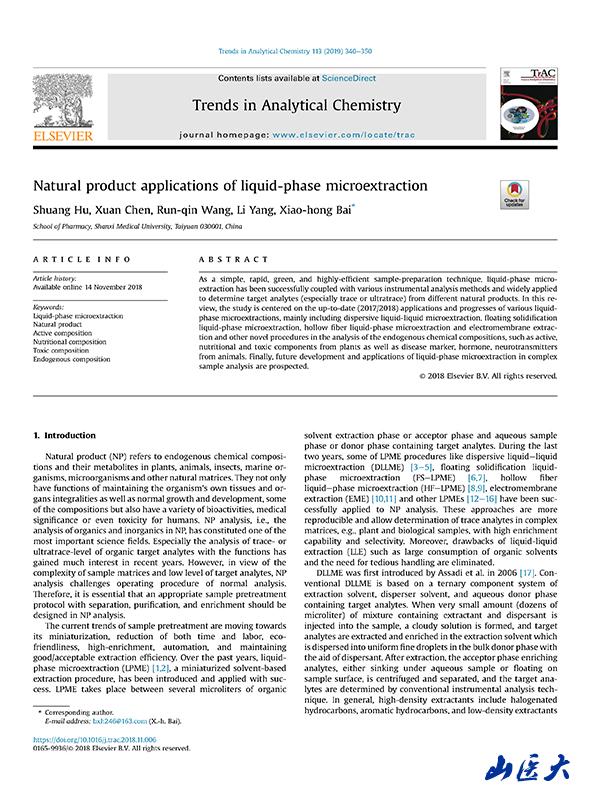 3月21日,我校藥學院藥物分析教研室白小紅教授課題組應分析化學TOP 1學術期刊Trends in Analytical Chemistry邀請撰寫的《Natural product applications of liquid-phase microextraction》正式發表(Shuang Hu, Xuan Chen, Run-qin Wang, Li Yang, Xiao-hong Bai. Natural product applications of liquid-phase microextraction.TrAC,2019,113:340-350)。