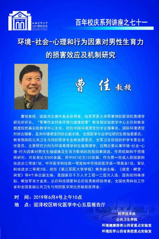 曹佳教授——環境—社會-心理和行為因素對男性生育力的損害效應及機制研究