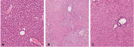 圖2過(guò)繼轉(zhuǎn)移體外擴(kuò)增的Treg細(xì)胞后AIH模型小鼠肝臟病理變化(A:正常肝臟B:AIH模型肝臟C:過(guò)繼轉(zhuǎn)移Treg后肝臟)