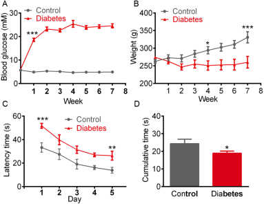 圖1糖尿病大鼠的血糖水平,體重和認(rèn)知功能A,實(shí)驗(yàn)期間糖尿病和對(duì)照大鼠的空腹血糖水平;B,體重曲線(xiàn);C,為兩組大鼠定位航行試驗(yàn)中逃逸潛伏期的比較;D,為兩組大鼠空間探索試驗(yàn)中目標(biāo)象限逗留時(shí)間的比較。*,**和***分別與對(duì)照相比p <0.05,p <0.01和p <0.001。