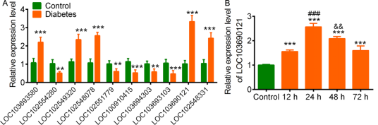 圖4.高葡萄糖對(duì)LOC103690121表達(dá)的影響A,葡萄糖處理后10個(gè)顯著表達(dá)lncRNAs的相對(duì)表達(dá)水平。B,LOC103690121葡萄糖處理后的表達(dá)模式