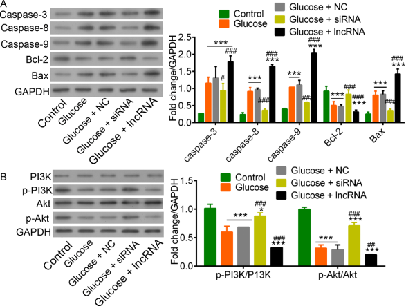 圖6.Western印跡分析.A,凋亡相關(guān)蛋白的倍數(shù)變化,B,PI3K / Akt途徑蛋白的倍數(shù)變化。*和***分別與對(duì)照相比p <0.05和p <0.001。相對(duì)于葡萄糖處理,#,##和###注意到p <0.05,p <0.01和p <0.001。