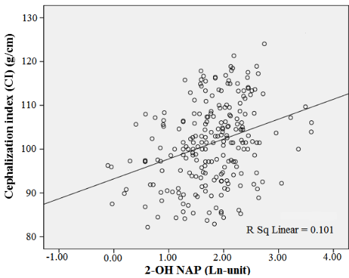 圖一.孕婦尿中2-OHNAP與新生兒CI指數之間關系的散點圖