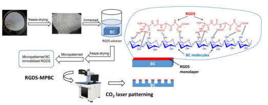 仿生生物材料被認(rèn)為可引導(dǎo)新生組織模擬原組織結(jié)構(gòu),有望推動(dòng)未來(lái)醫(yī)學(xué)領(lǐng)域的發(fā)展。細(xì)菌性纖維素作為一種價(jià)格低廉、高產(chǎn)的3D網(wǎng)絡(luò)納米纖維生物材料,因其可在水合狀態(tài)下模擬原有皮膚組織,且其高的溶脹性能可利于皮膚傷口的愈合;因此,它可很好的應(yīng)用于組織工程領(lǐng)域。近年來(lái),隨著經(jīng)濟(jì)的快速發(fā)展,人們的美學(xué)需求逐步提升,使新形生皮膚組織無(wú)疤痕愈合成為一大熱點(diǎn)。但目前的傷口敷料均無(wú)此特性。因此,需探索一種新型的微圖案技術(shù)以改性細(xì)菌性纖維素,誘導(dǎo)傷口處功能性細(xì)胞的分布,實(shí)現(xiàn)膠原的重排和傷口無(wú)疤痕愈合。但因細(xì)菌纖維素自身材料的限制,目前的刻蝕技術(shù)并不適用于細(xì)菌纖維素。需要尋找一種低能量的刻蝕技術(shù)來(lái)構(gòu)造微圖形才可保證膜的完整性。隨后,在不斷的研究探索中發(fā)現(xiàn),使用低能量的CO2激光刻蝕技術(shù)和小分子生物活性肽的結(jié)合,可對(duì)功能性細(xì)胞的增殖和遷移產(chǎn)生影響,且改性后的功能薄膜對(duì)成纖維細(xì)胞和膠原蛋白有雙重親和力。但是在無(wú)疤痕愈合的圖形篩選過(guò)程中,究竟何種圖形對(duì)無(wú)疤痕愈合效果最佳,尚需進(jìn)一步的體內(nèi)外和分子實(shí)驗(yàn)加以探究。