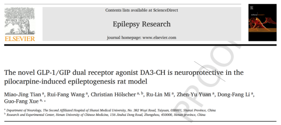 薛國芳課題組首次觀察到新型GLP-1/GIP雙受體激動劑DA3-CH具有抑制癲癇發生的神經保護作用,研究成果“The novel GLP-1/GIP dual receptor agonist DA3-CH is neuroprotective in the pilocarpine-induced epileptogenesis rat model”于2019年5月7日收錄于《Epilepsy Research》(圖1)。
