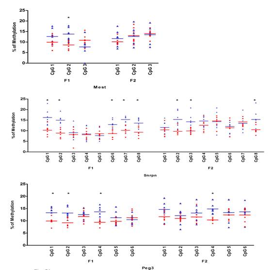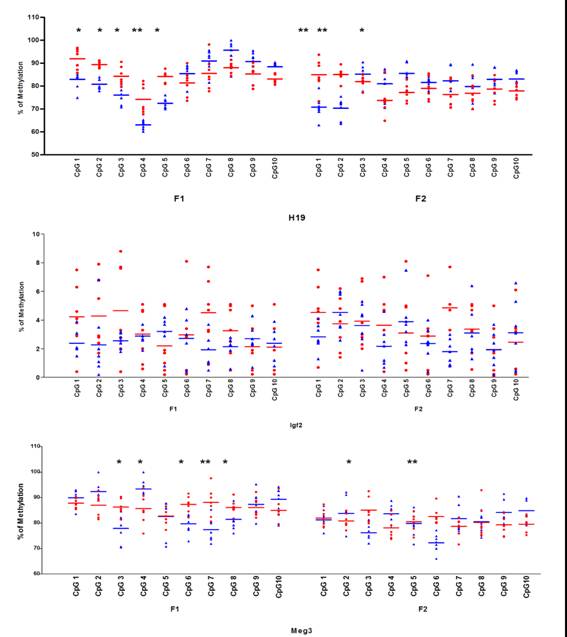 BaP誘導(dǎo)未暴露后代印記基因DMR區(qū)甲基化水平改變。亞硫酸鹽焦磷酸測(cè)序測(cè)定未暴露的F1-2后代精子DNA印記基因H19、Peg1和Igf2以及印記基因Meg3、Peg3和Snrpn的甲基化水平。顯示的數(shù)據(jù)是來自BaP2.5和對(duì)照組的各7只實(shí)驗(yàn)動(dòng)物獨(dú)立CpG位點(diǎn)的甲基化水平。比較對(duì)照組小鼠,橫線代表均數(shù)。*,q<0.05(FDR,通過多重測(cè)試糾正)