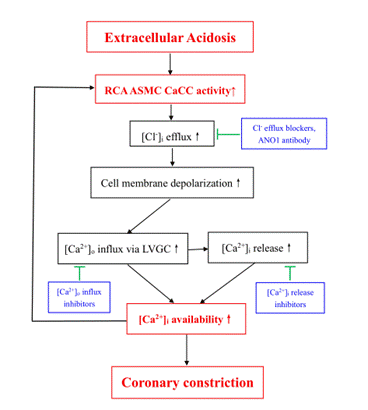 研究發現,相對于大鼠腎內動脈、腦基底動脈、腸系膜動脈平滑肌層及其動脈平滑肌細胞,大鼠冠狀動脈及其動脈平滑肌細胞表達了更多的TMEM16A/ANO1,由細胞內鈣釋放和外鈣內流引起的細胞內Ca2+升高和鈣激活氯通道引發的Cl-外流在大鼠冠狀動脈對細胞外酸中毒高收縮反應性中起重要作用。這些結果提示,調節動脈平滑肌細胞鈣激活氯通道的活性和細胞內的Ca2+水平可能會成為一個新的,有效的預防和治療酸中毒引起的心臟-冠狀動脈問題的新方法。