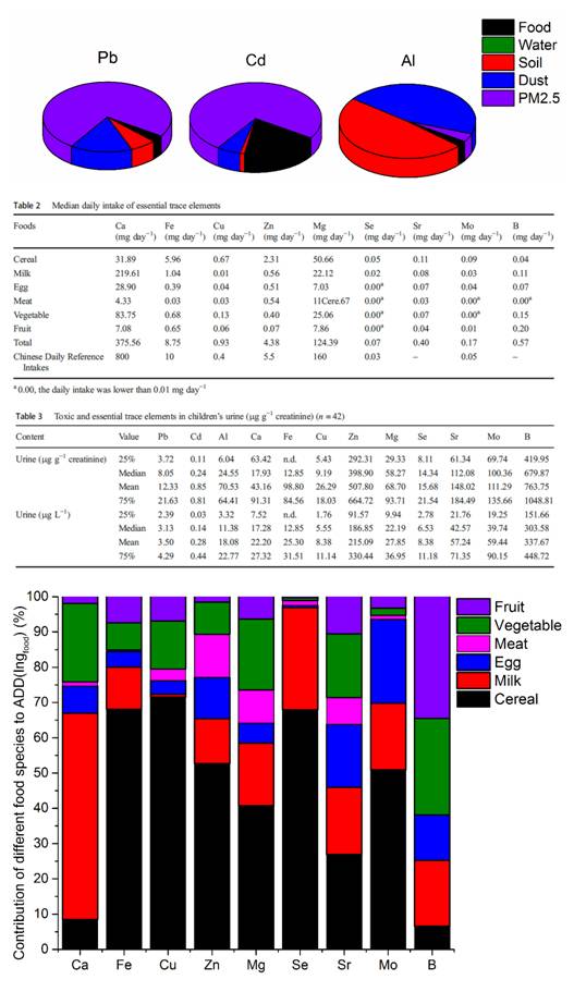 多數研究側重于居住在典型的受污染地區或電子垃圾拆解地點附近的兒童的健康風險,卻忽視了居住在農村地區兒童的健康風險。本次研究以農村兒童為研究對象,發現環境樣本中鉛(Pb)和鎘(Cd)的濃度低于設定的閾值,表明非致癌風險較低。此外,灰塵和土壤的污染是導致鋁含量增加的主要原因。應更多地注意兒童頻繁的手——口和物——口活動,以減少鋁毒性的潛在健康風險。在必需微量元素方面,膳食鈣(Ca)攝入量遠低于中國每日參考攝入量,96.0%的兒童出現鈣(Ca)含量不足。增加農村兒童的牛奶攝入量是當務之急。兒童硒(Se)和鉬(Mo)的膳食攝入量較高,而硼(B)的膳食攝入量不足。建議膳食中補充富含硼(B)的食物以改善農村兒童健康。綜上所述,這些農村兒童的健康風險是有毒飲食和營養不良并存造成的。建議當地政府有必要增加學校膳食中的鈣攝入量,減少鋁污染,以保護農村人口尤其是兒童的健康。