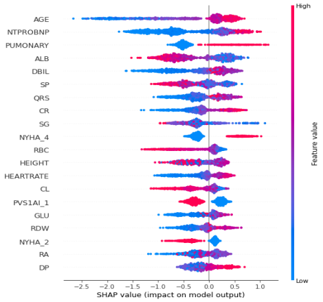 Figure2SHAP summary plots for the risk of adverse outcomesinpatients with HF.The importance ranking of the top 20 risk factors withstability and interpretation usingSME-XGBoostmodel.The SHAP value (x axis) is a unified index responding to the impact of a feature in the model. In each feature importance row, all patients’ attribution to outcome were plotted using different color dots, in which the red dot represented highriskvalueand the blue dotrepresentedlowriskvalue.