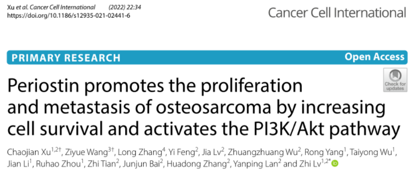 2022年1月20日,c7c7.app第二醫院骨科徐朝健教授在國際期刊Cancer Cell International以Article形式發表題為“Periostin promotes the proliferation and metastasis of osteosarcoma by increasing cell survival and activates the PI3K/Akt pathway”的研究論文。