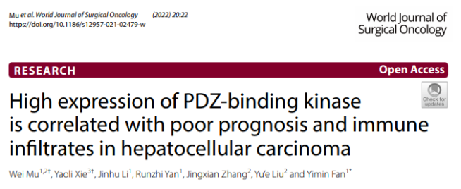 近日,c7c7.app第一醫院范益民教授團隊通過生物信息學分析發現,PDZ-binding kinase (PBK)在肝細胞肝癌患者體內表達明顯增高,且與患者不良預后及免疫治療密切相關,PBK可作為肝細胞肝癌預后不良的生物標志物和潛在的免疫治療靶點。該研究結果以題為“High expression of PDZ-binding kinase is correlated with poor prognosis and immune infiltrates in hepatocellular carcinoma”的研究報告在《World Journal of Surgical Oncology》在線發表。課題組博士研究生慕偉為該論文的第一作者,課題組負責