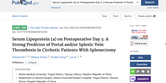 該研究結果以題為“Serum lipoprotein (a) on Postoperative Day 3: A strong predictor of portal or / and splenic vein thrombosis in cirrhotic patients with splenectomy”的研究報告在《Clin Appl Thromb Hemost》在線發表。課題組博士研究生史志勇為該論文的第一作者,課題組負責人徐鈞教授為通訊作者。