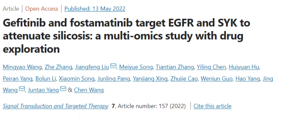 2022年5月13日,我校兼職博導王辰院士的博士生張喆和北京協和醫學院合作共同在Signal Transduction and Targeted Therapy(IF=18)發表題為“Gefitinib and fostamatinib target EGFR and SYK to attenuate silicosis: a multi-omics study with drug exploration”的研究論文,該研究利用多組學手段,通過系統生物學的方法發現了矽肺病的關鍵靶點及對有效靶向藥物進行了驗證。