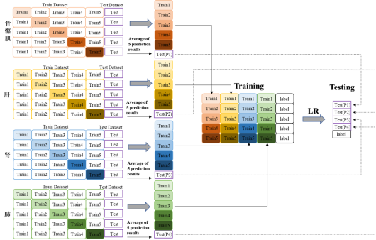 依據骨骼肌、肝臟、腎臟、肺臟所有時間點差異性小分子化合物,對各器官組織分別進行RF、SVM、MLP三種機器學習模型的建立,通過比較驗證集ROC曲線及AUCs,確定各器官組織最優模型。將各器官組織的最優模型進行多器官組織多指標多模型的Stacking集成學習,集成學習模型流程圖如圖5所示。將測試集數據代入集成學習模型中,最小平均AUCs=0.95,且具體時間點0d、1d、2d、3d、5d、15d、18d、24d、27d和30d的AUCs為1.00,集成學習模型的準確率高達78%,遠高于單一器官組織模型。與第三部分實驗結果相比,雖多器官組織指標融合的RF模型預測準確率也為78%,但本部分中集成學習模型的AUCs更高(0.95vs0.91),且14個死后時間點中的10個時間點的模型AUCs=1.0。這也就說明了集成學習模型的優越性,可用于PMI推斷的研究,達到了本研究的預期目的。